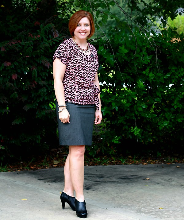 Today I paired the bird print blouse with the grey pencil skirt for church. I wore the booties again too. I’ve accessorized with a new necklace that I purchased during a Loft 50% off sale. It’s a perfect piece to have for fall. I’m glad I didn’t restrict myself from shopping during my 30×30 because I would have likely missed the necklace.