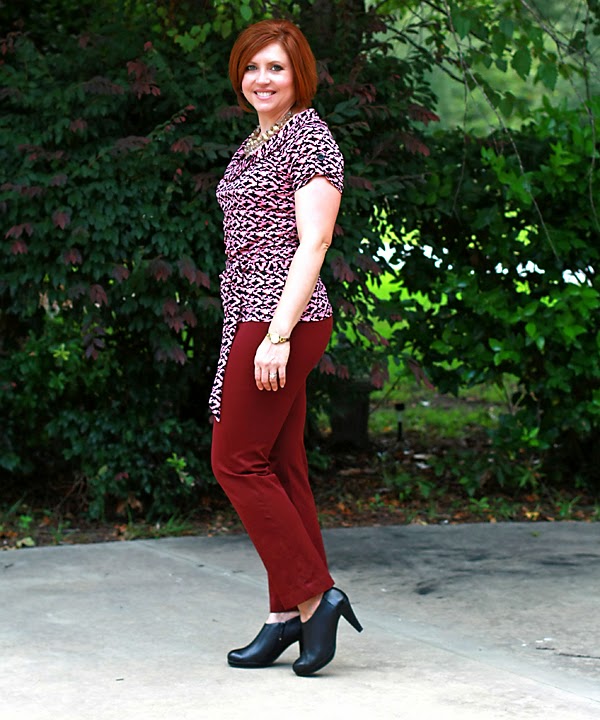 Happy Wednesday! With a holiday it’s a short work week, and half-way done! Today’s outfit is #3 of my 30X30 remix. I’ve paired a bird print top with burgundy slim ankle pants and booties. I’ve seen lots of blush and burgundy for fall, so I’m set with purchases from last year. I didn’t wear the top much last year so I’m remedying that during my 30X30. This is not the typical outfit I’d wear to my conservative office, so I’ll probably throw the black blazer on with this today too.