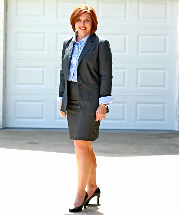 A great power suit is a good investment for anyone in the corporate world or a conservative business environment. I have the matching pants to this, but only chose the skirt for my 30×30 remix. Last week I paired it with mustard, but today I’m going with the blue pinstripe button down.
