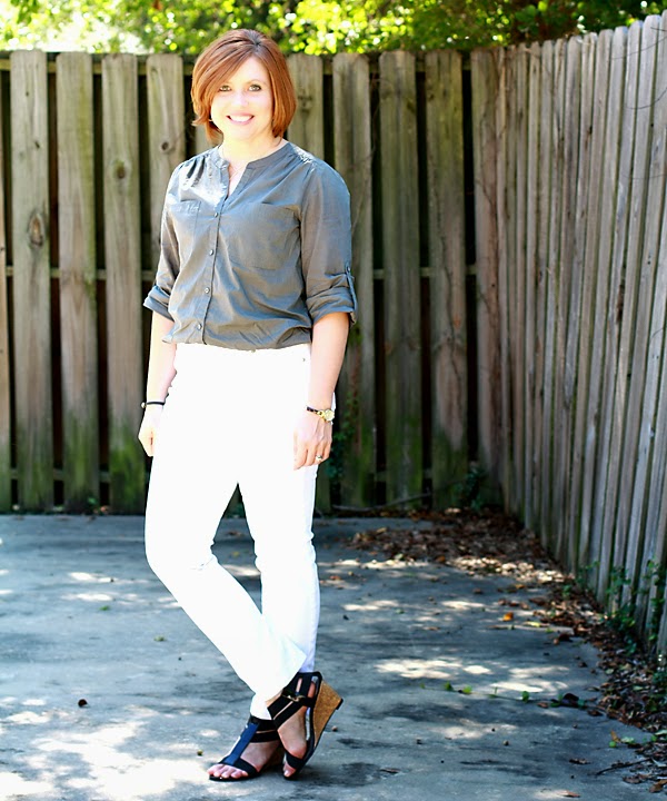 Some version of white jeans and my olive top has been on my “to wear” list ever since I pinned this outfit. (Do you have a “to wear” list? You know, all those pins and outfits you’ve come up with but need to appropriate time or occasion to wear? This happens to me a lot with casual attire since I spend so much time in work wear.)