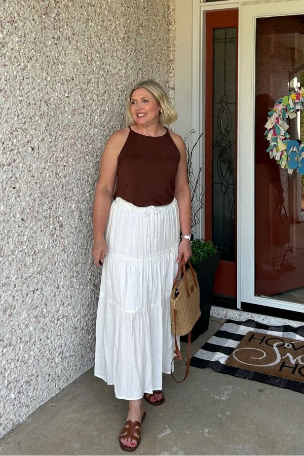 Chocolate brown has been popular for summer so we can’t leave it out of the equation. A brown tank looks chic paired with a white maxi skirt and cognac sandals.