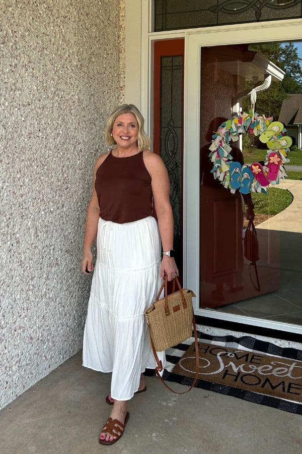Vest- Amazon; skirt- Amazon; sandals- Amazon; purse- Amazon