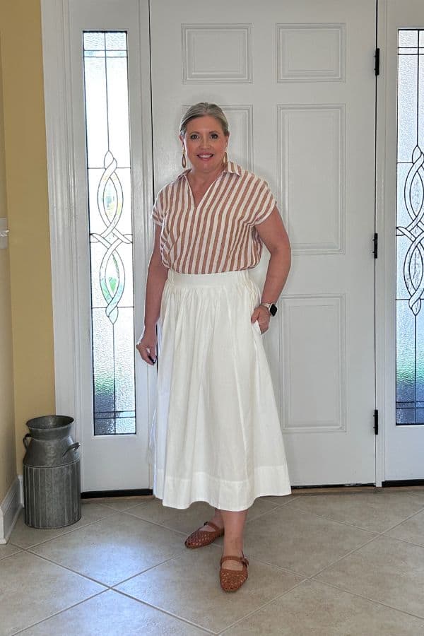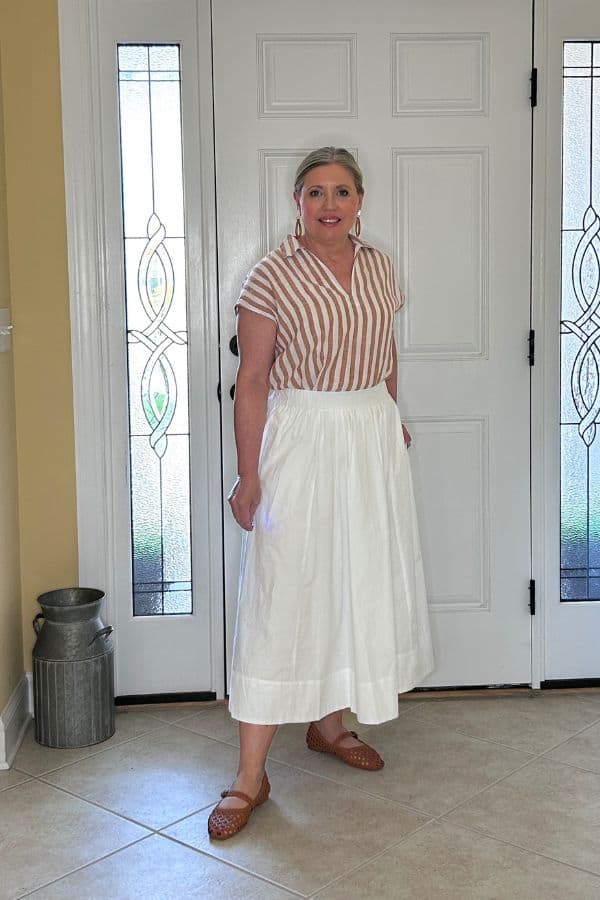 Striped pop over top +white midi skirt + woven Mary Jane Sandals