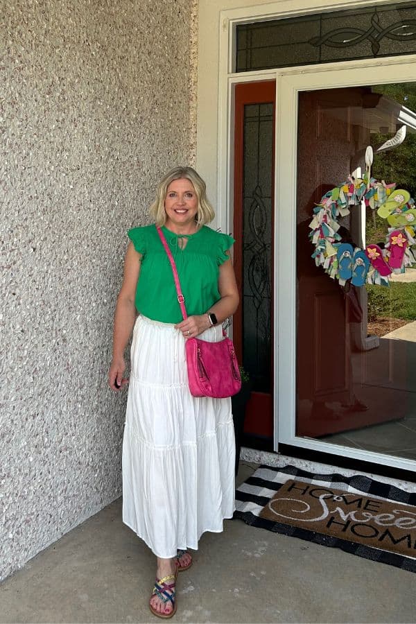 Green flutter sleeve top + white maxi skirt + multi color sandals