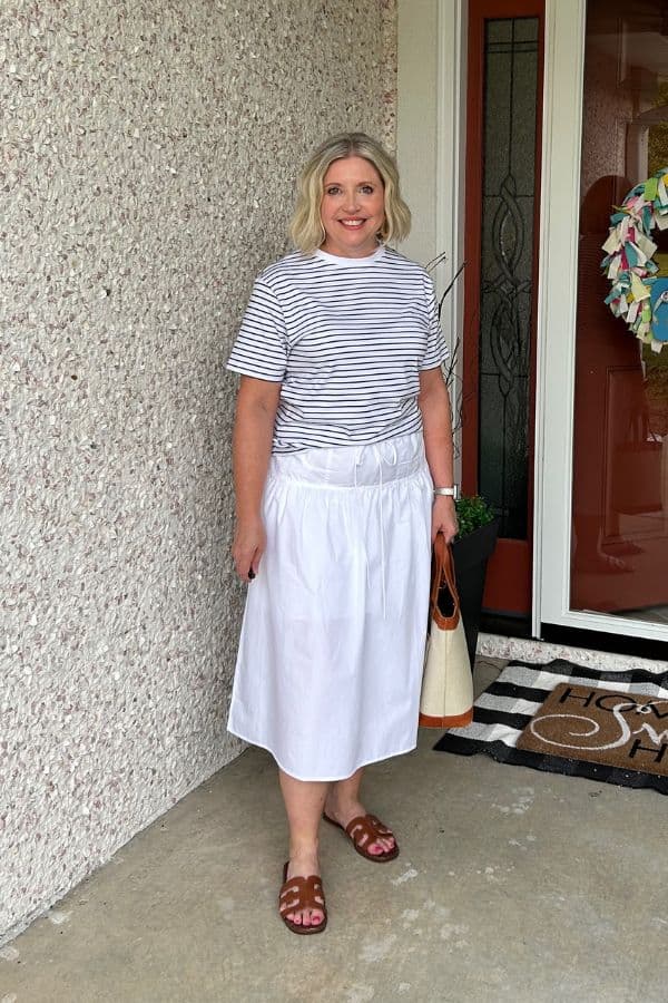 Your black and white striped tee goes with everything, including your white skirt. Create a little contrast with cognac sandals.